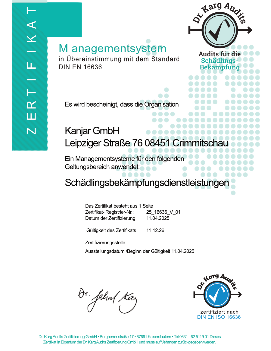 Wir sind ein durch Dr. Karg zertifizierter DIN 16636 Fachbetrieb für Schädlingsbekämpfung